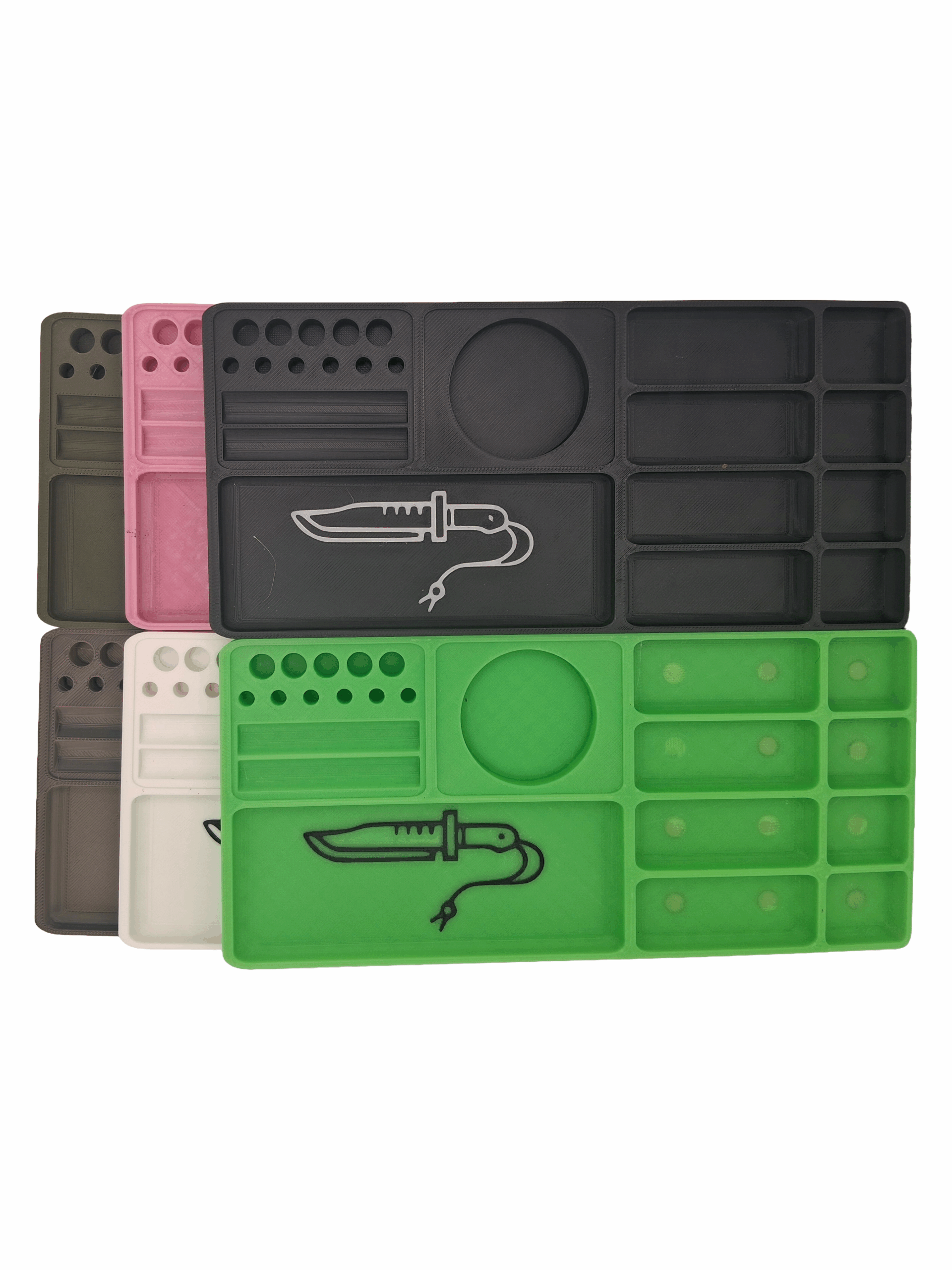 Knife Tinkering Tray is ~8″x4″x.5″ with specialized compartments for the takedown of pocket knives. 11 bit holders, 1 general use, 1 round holder for quick placement of a .5oz tin of Texas Blade Butter, and 8 magnetized compartments for easy screw/small parts accessibility.