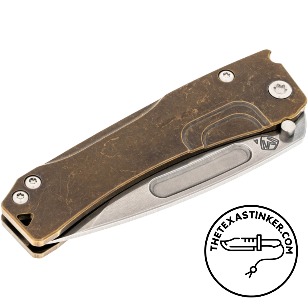 4.25″ (10.8cm) closed. 3.5″ (8.89cm) tumbled finish S45VN stainless drop point blade. Bronze anodized titanium handle. Thumb stud. Pocket clip. Left hand version. Boxed.